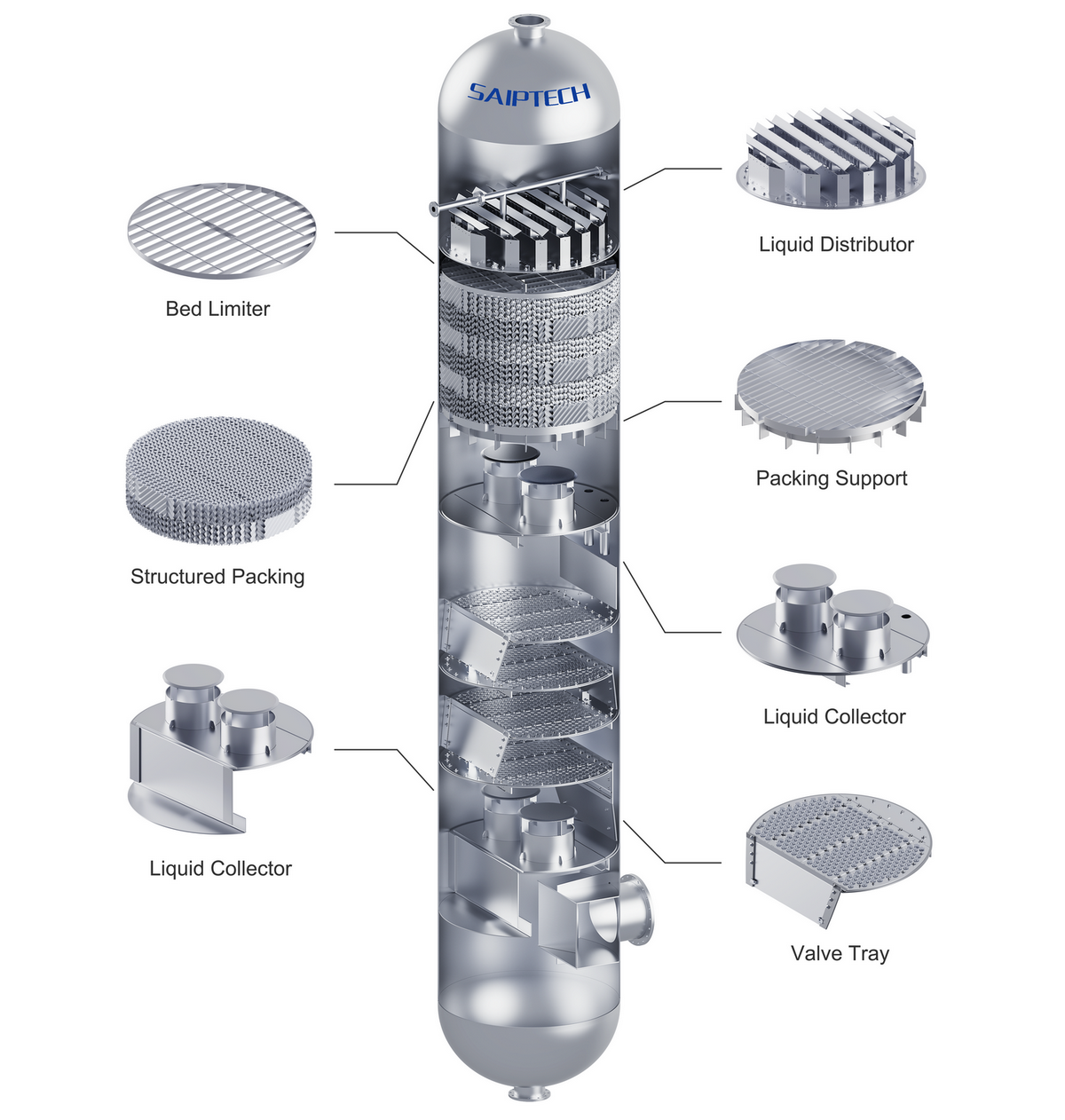 At Saiptech we take special care to assure that liquid and vapor distribution to the packed bed is uniform and that the equipment is selected to best handle any special process considerations, such as fouling or foaming. We offer a proven line of distributors and redistributors for a wide range of flow rates, physical properties, and turndown requirements.