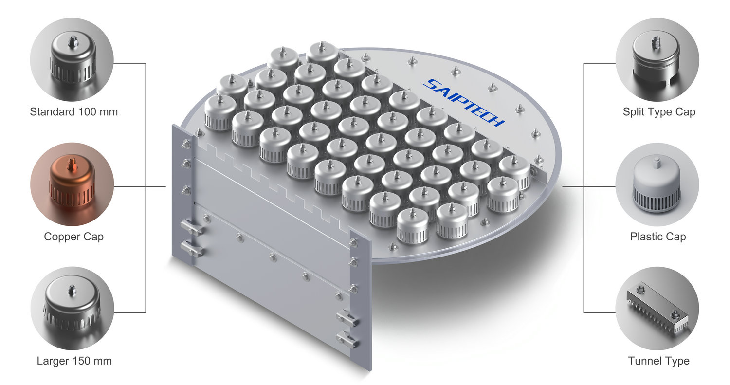 Saiptech designs and provides a variety of bubble cap trays in which are the most leak free trays available. Our most common bubble cap designs include conventional slotted caps (some have slots for vapor passage and others do not). Of course, custom designs are available as well. The potential mechanical configurations for the various riser and cap assemblies are numerous.